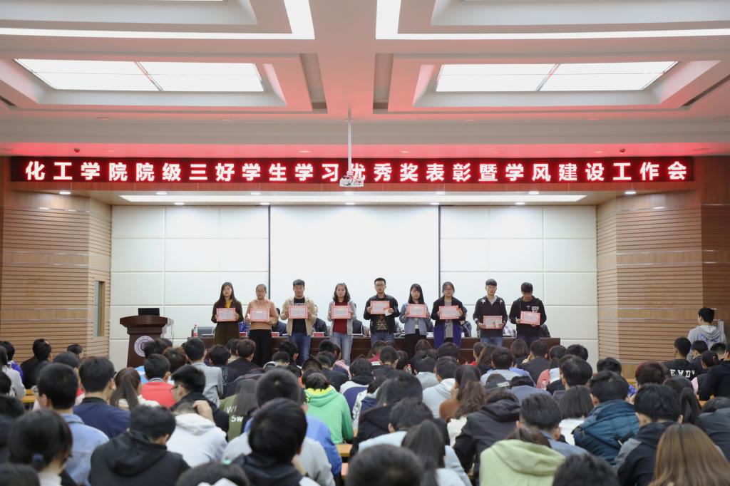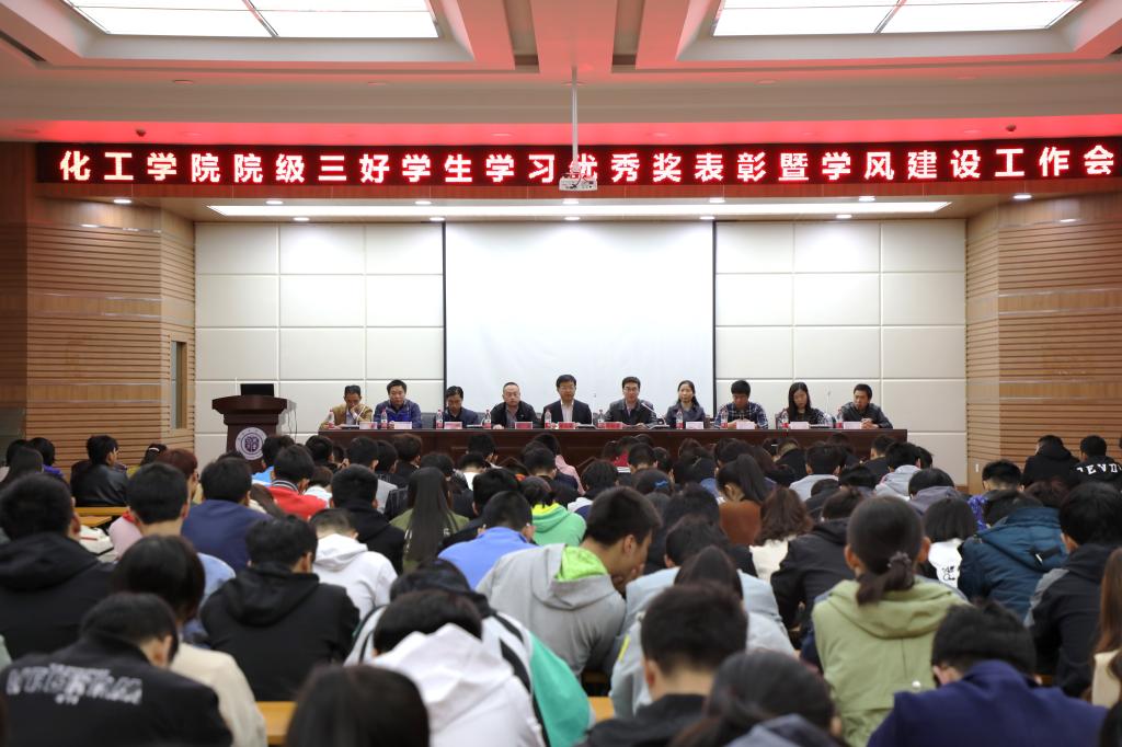 3月24日上午9:00,化工学院第一届院级三好学生、学习优秀奖颁奖暨学风建设工作会在校二教报告厅举行。学院院长董文魁、党委书记薛林贵、副院长赵丽、学院各系室中心主任、院党委组织员、院团委书记、全体班主任、获奖学生、学院本科生共计300多人出席了颁奖仪式,本次会议以端正学习态度,提高学业成绩和考研率、促进优良学风养成为主题,会议由副书记副院长周渊主持。